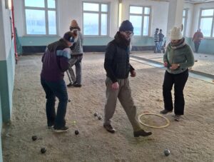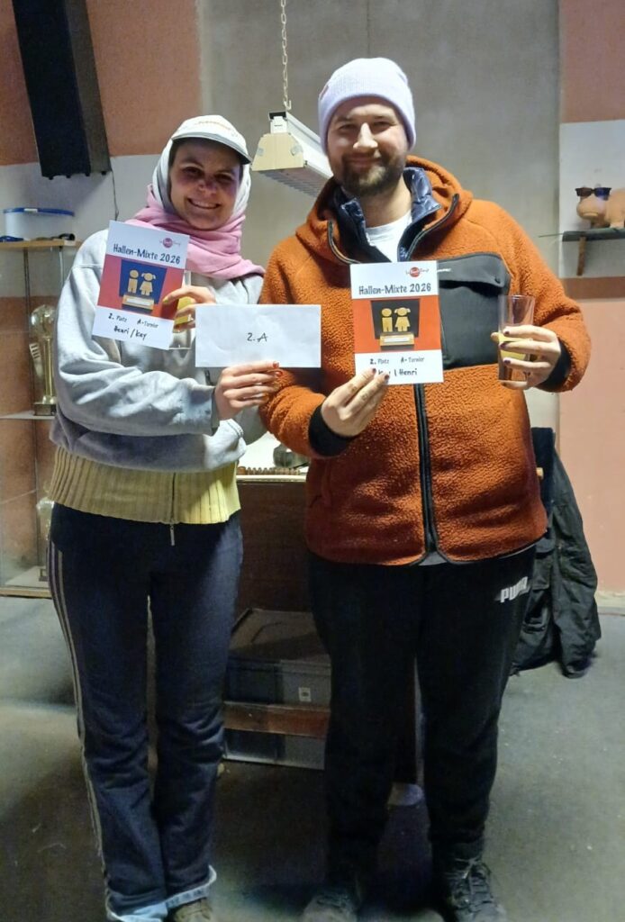 Weil das schneereiche Wetter das Starterfeld halbiert hatte, traten am vergangen Samstag nur 14 Teams, diese aber frisch und gutgelaunt, zur Hallen-Mixte 2026 an. In Begleitung zweier Heizpilze (Danke Dietmar!) und mit den passenden Getränken ließen sich die Temperaturen in der mittags sogar sonnendurchfluteten Halle gut ertragen. Nach drei zeitbegrenzten Vorrunden teilte sich die Spreu vom Weizen und spielte jeweils im A- oder B-Turnier weiter.