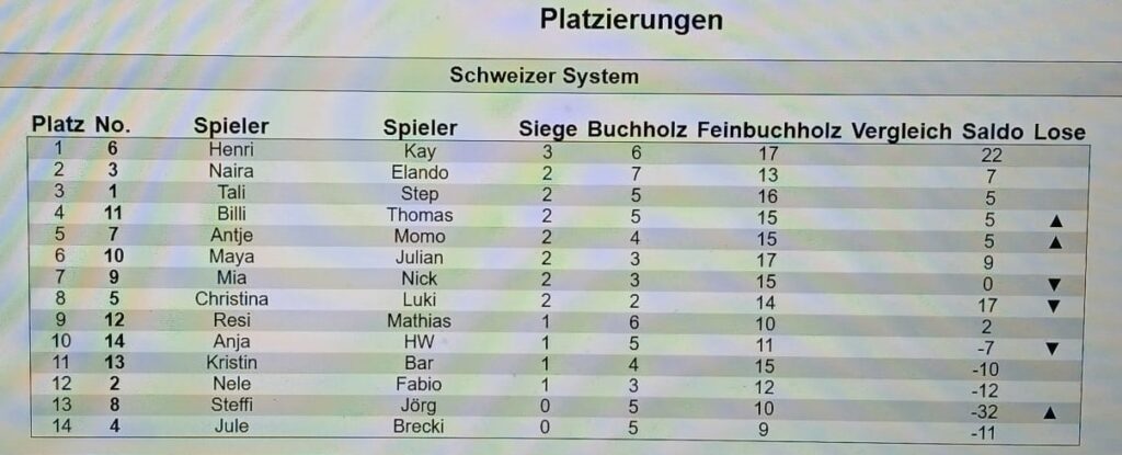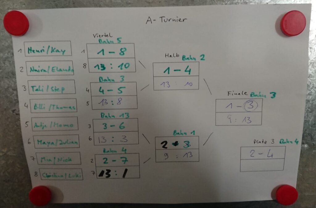 Nach erfolgreichen Viertelfinalspielen standen sich im Halbfinale A Henri/Kay und Bili/Thomas sowie Naira/Elando und Tali/Step gegenüber. Mit knappen Siegen hielten Henri/Kay und Tali/Step dann Einzug ins Finale, wo sich im „spannendsten Finalspiel ever“ (O-Ton Step) das Dresdner Team Talena Thielecke /Stefan Lauche gegen die Gäste aus Leipzig durchsetzte und damit den Pokal gewann! Herzlichen Glückwunsch 🙂