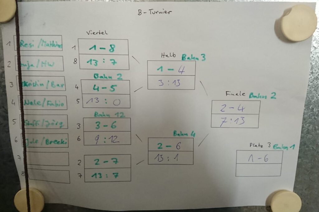 Das Halbfinale B bestritten nach der Barrage die Teams Resi/Mathias gegen Nele/Fabio und Anja/HW gegen Jule/Brecki – hier waren die Ergebnisse deutlicher: mit Punktedifferenzen von 10 und 12 Punkten sicherten sich Nele/Fabio und Anja/HW die Finalteilnahme, welches nach einem klasse Spiel („Boule ist so geil“ – O-Ton Nele :D) das Leipziger Team Nele/Fabio mit 13:7 für sich entschied.