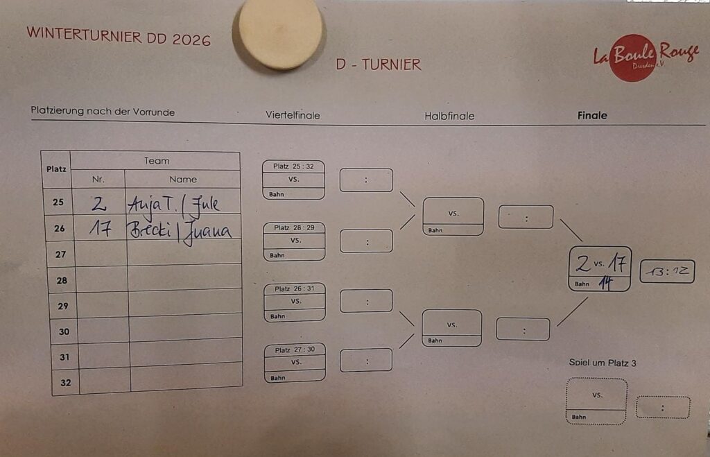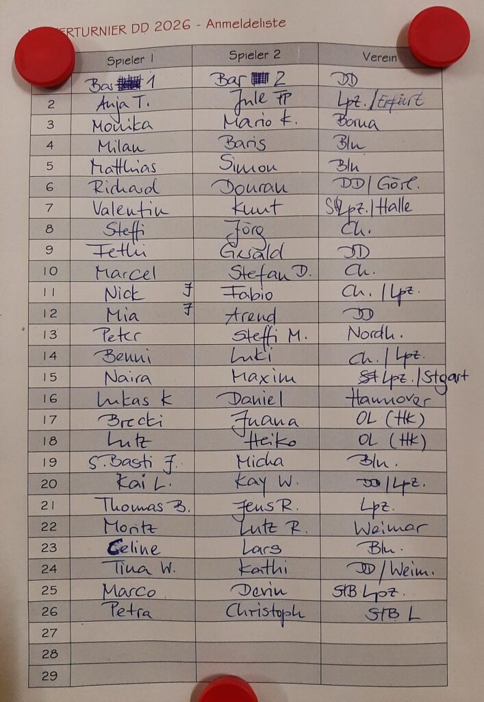 Nun zum Turnier: Neben den Spielern des PVO konnten wir auch Gäste aus dem fernen Osten (Görlitz), Westen (Hannover) und Süden (Stuttgart) begrüßen. Und Berliner. Nach den üblichen drei zeitbegrenzten Vorrunden wurde im ABCD-Modus weitergespielt und schon nach kurzer Zeit standen die ersten Gewinner fest: Jule FP und Anja T. siegten im D-Turnier 🙂 Alle anderen mussten erst die Viertel- und Halbfinale überstehen, bevor sie einem Treppchenplatz nahe waren. Nach schönen und spannenden Spielen standen gegen 19 Uhr dann alle Sieger fest: im A-Turnier und damit den Pokal gewann das Berliner Team Celine Grauer / Lars Schirmer – herzlichen Glückwunsch! Den 2. Platz konnte das Leipziger Team Jens R. / Thomas B. für sich verbuchen, den 3. Platz teilten sich Kai L. / Kay W. mit Micha K. / Sebastian J. aus Berlin. Im B-Turnier konnte sich das PVO-Jugendteam Nick Z. / Fabio T. nach einem harten Kampf gegen die Hannoveraner Lukas Kissler / Daniel Rathe mit einem knappen 13:11 den Sieg erkämpfen. Der Sieg im C-Turnier ging an Marcel / Stefan D. aus Chemnitz, Platz 2 holten sich Monika K. / Mario K. aus Borna. Die Turnierbäume mit allen Ergebnissen findet ihr unten nach den Fotos.